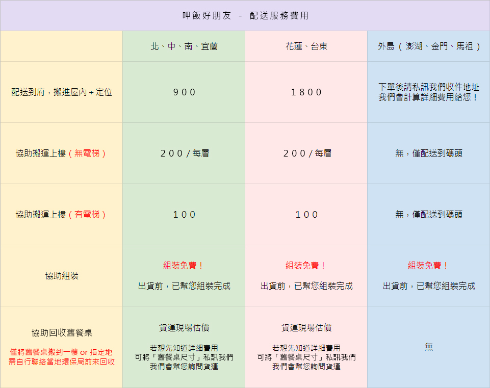 並提供協助組裝、搬運上樓、回收舊餐桌...等服務