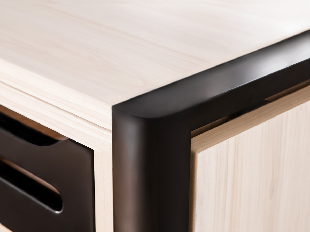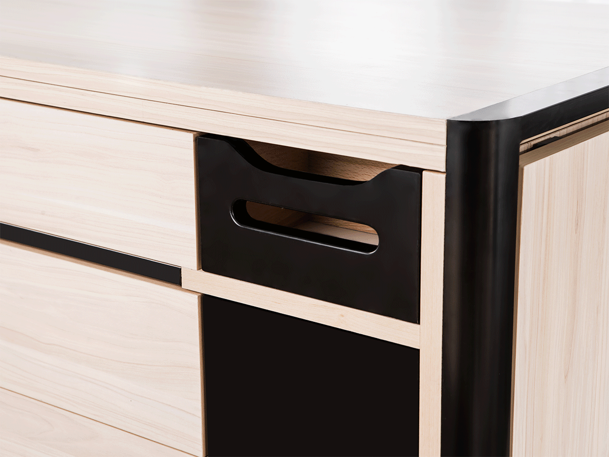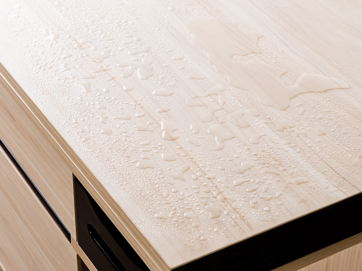 ▲ 接下來,這款所有木板種類中,耐磨係數最高的板材「美耐板」,一般用於裝潢板材、商業空間、系統櫥櫃、耐磨需求高的木地板等處。而咱們使用的芯材,更是甲醛含量極低(1.5mg/L),符合歐洲最高環保標準的 E1 級環保木材。