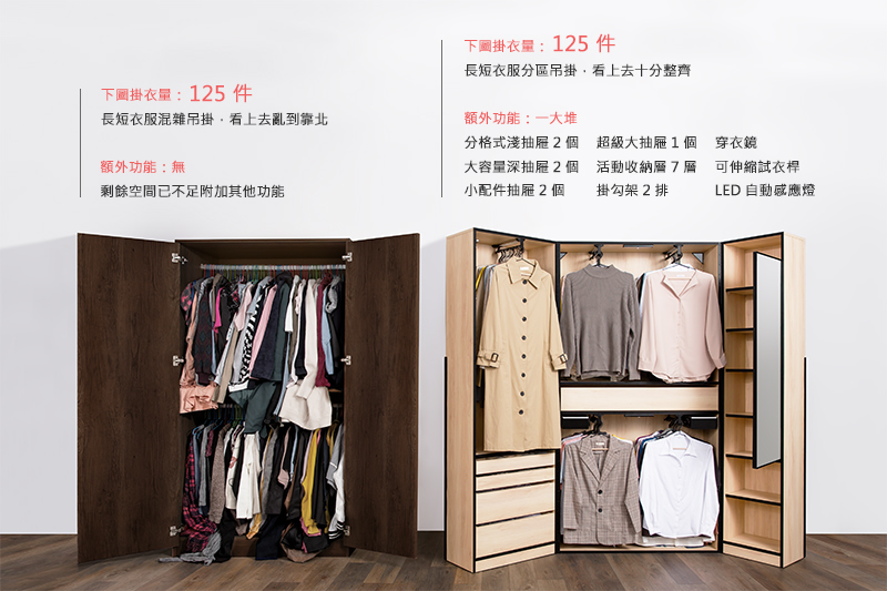 掛衣量勢均力敵,再加上抽屜、層板後,整體收納量大勝