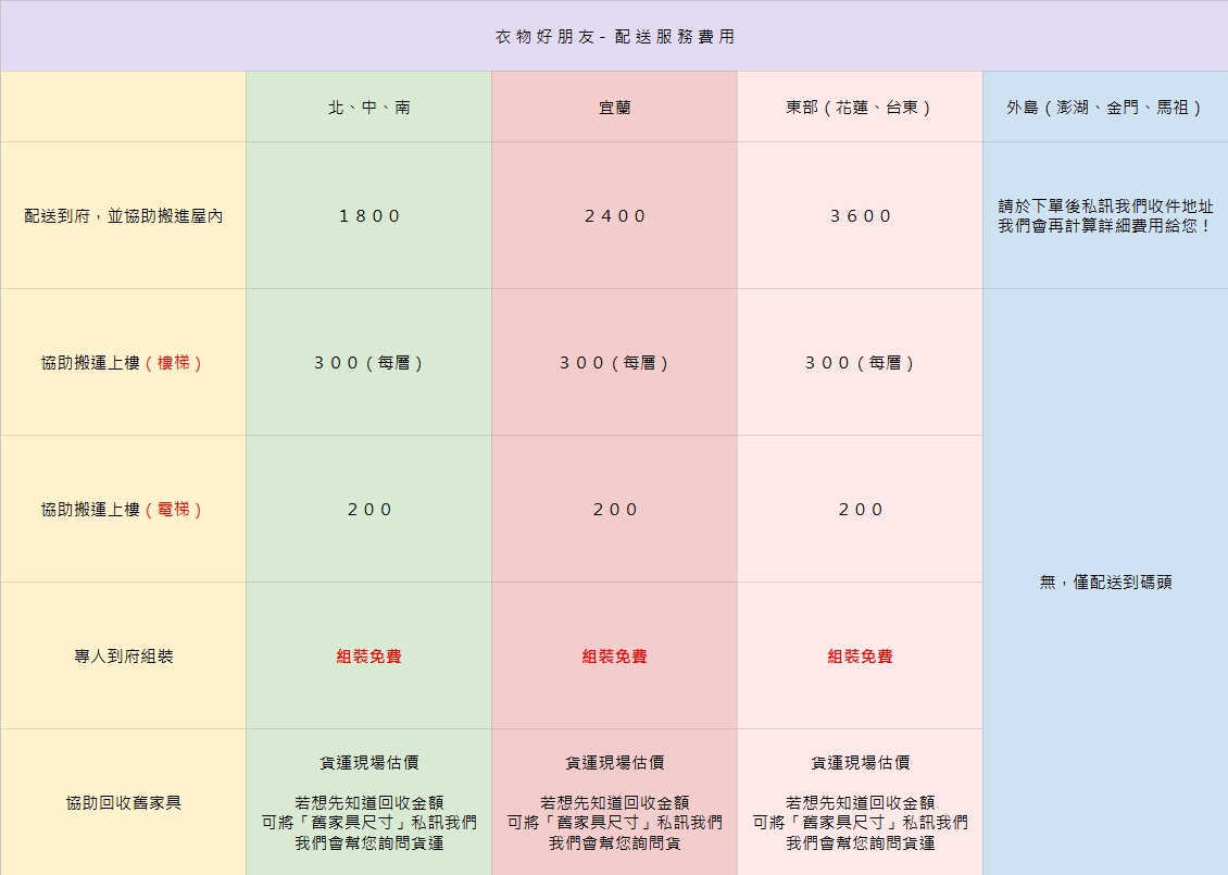 A:只要配送地點是台灣的國土,不論本島外島,大部分的好朋友都是0運費!但類屬大型家具的客廳、呷飯、衣物、鞋子好朋友 - 大除外,因這三個小胖子較重,配送難度高了許多,且貨運大哥會附帶其他服務,如送貨到府並搬進屋內、協助搬運上樓、協助回收舊家具、協助示範操作等,因此會視每個人需求的服務內容不同,酌收幾百塊不等的服務費用哦!詳細的服務內容及費用,可參考這2款好朋友介紹頁下方的表格!