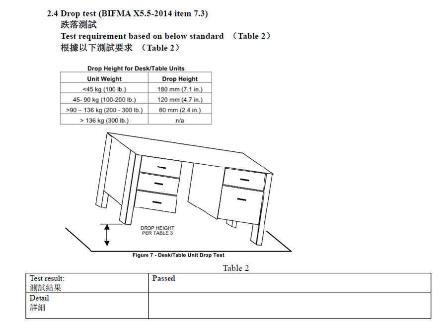 A:辦公好朋友通過多項 BIFMA 品質檢測,檢測項目共 12 項:尺寸測試、垂直加載穩定性測試、整桌偏移測試、跌落測試、防碰撞、單立柱自鎖、整桌自鎖、立柱居中壽命測試、整桌壽命測試、動態特性測試、復位測試、分散負荷測試。申請的 12 項品質檢測全數通過!