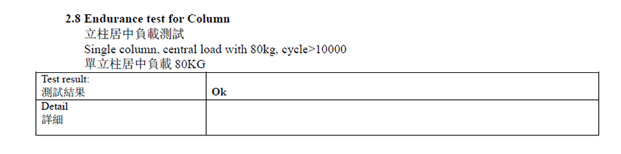 ▲ 單立柱居中負載測試:測試單一立柱負載 80 kg 下,重複循環 10,000 次是否仍正常。測試結果:正常。