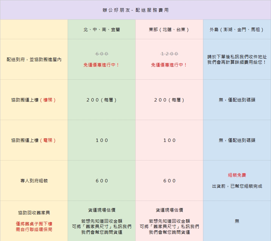 另外也提供到府組裝、搬運上樓、回收舊桌子…等額外服務