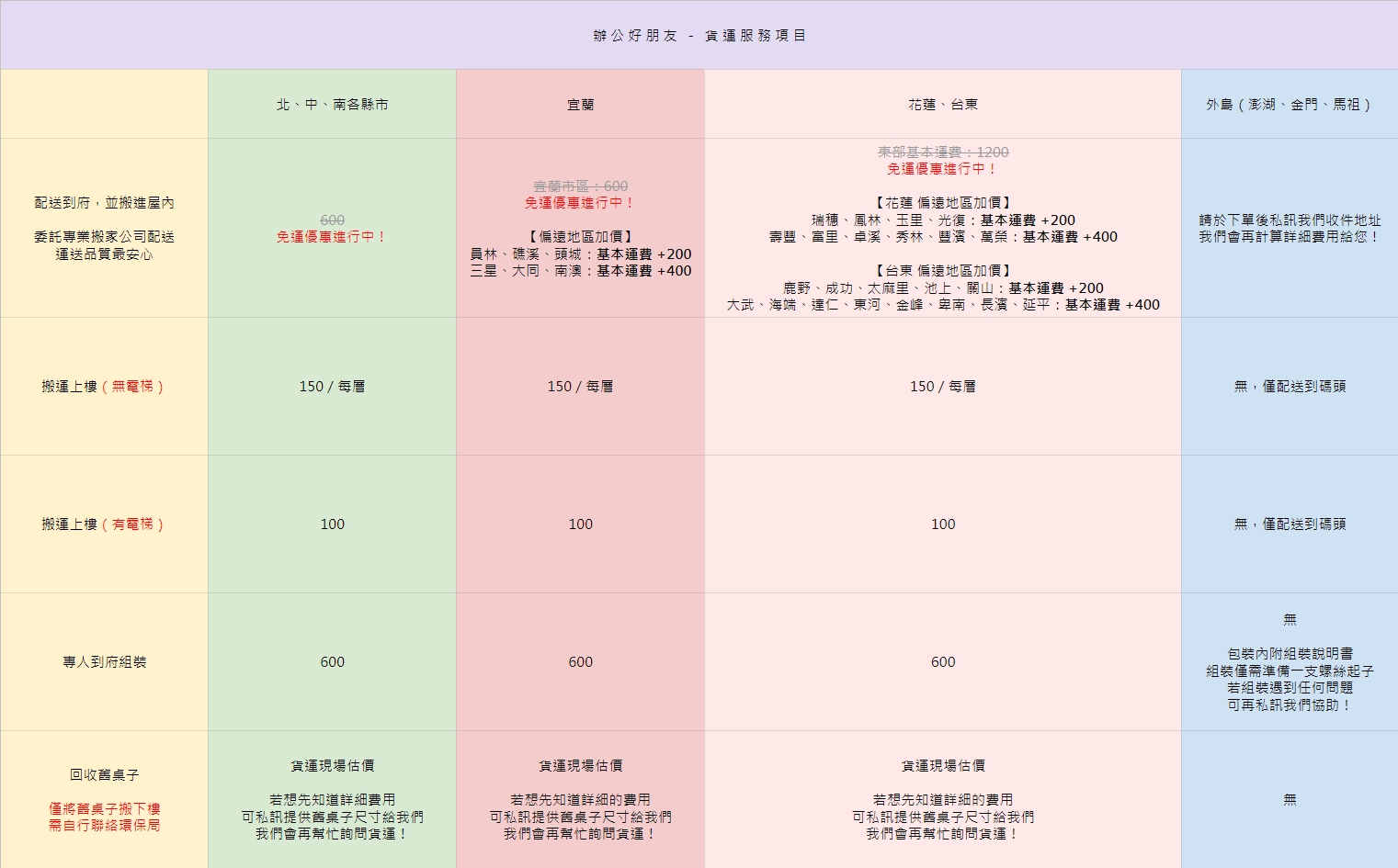 另外也提供到府組裝、搬運上樓、回收舊桌子…等額外服務