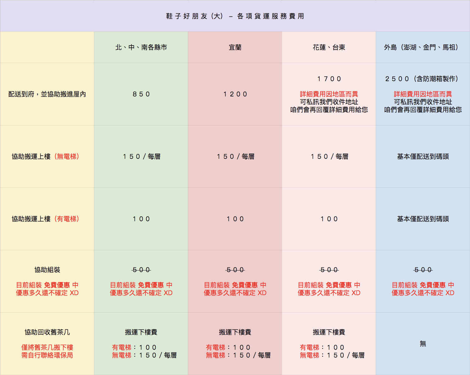 A:只要配送地點是台灣的國土,不論本島外島,大部分的好朋友都是0運費!但類屬大型家具的客廳、呷飯、衣物、鞋子好朋友 - 大除外,因這三個小胖子較重,配送難度高了許多,且貨運大哥會附帶其他服務,如送貨到府並搬進屋內、協助搬運上樓、協助回收舊家具、協助示範操作等,因此會視每個人需求的服務內容不同,酌收幾百塊不等的服務費用哦!詳細的服務內容及費用,可參考這2款好朋友介紹頁下方的表格!